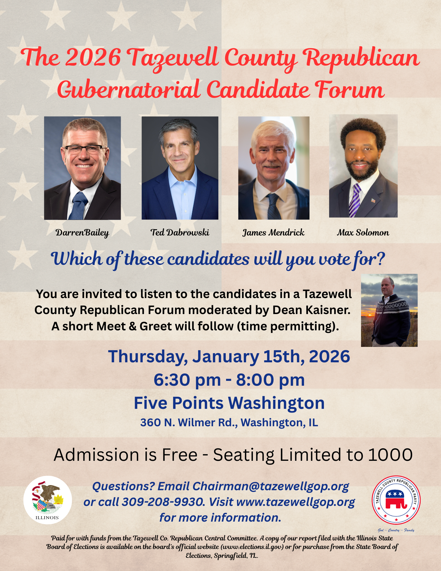 The Tazewell County Republican Party is hosting a Republican Gubernatorial Candidate Forum at Five Points Washington on Thursday, January 15th, 2026. The event will begin promptly at 6:00 pm and will end at 8:00 pm. The forum will be moderated by Tazewell County's own Dean Kaisner who has moderated numerous forums and debates in the past including the 2022 Gubernatorial Candidate Forum and the U.S. Senate Candidate Forum.